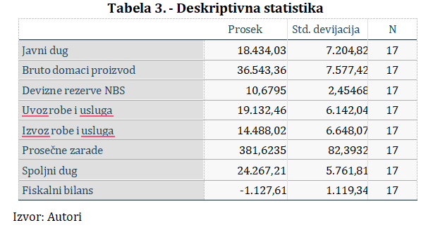 Vrednosti proseka i standardne devijacije za sve varijable su prikazane u Tabeli 3. Ove vrednosti se mogu koristiti za dalju analizu ali ih u konkretnom radu nećemo razmatrati. Možemo napomenuti da prosečna vrednost javnog duga u posmatranom periodu iznosi 18.434,03 miliona evra, da prosečna visina uvoza robe i usluga iznosi 19.132,46 miliona evra, prosečna visina izvoza robe i usluga iznosi 14.488,02 miliona evra, a da je prosečni fiskalni bilans Republike Srbije negativan i da iznosi -1.127,61 miliona evra.