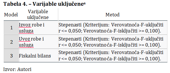 Tabela 4. prikazuje koje su sve varijable uključene u model korišćenjem stepenastog metoda koji se zasniva na tome da se nezavisne varijable uključuju u model jedna po jedna. Ovde se utvrđuje značajnost korelacije svake nezavisne varijable sa zavisnom kroz njihovu značajnost na nivou od 5%.