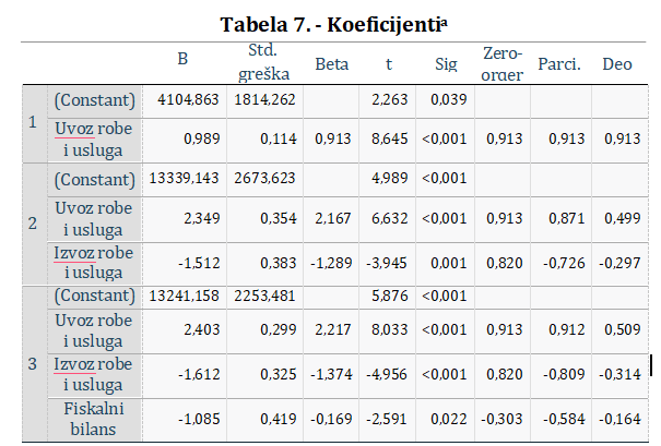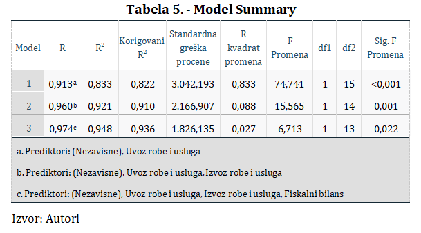 5. U trećem modelu vrednost R² iznosi 0,948, što je maksimum i stoga, treći model se može koristiti za razvijanje regresione jednačine. U trećem modelu vidimo tri nezavisne varijable i to: Uvoz robe i usluga, Izvoz robe i usluga i Fiskalni bilans. Vrednost R², odnosno koeficijenta determinacije, u ovom modelu je 0,948 što znači da navedene tri nezavisne varijable objašnjavaju 94,8% varijacija Javnog duga. Vidimo da je u trećem modelu signifikantnost 0,022 što je manje od 0,05, te možemo model smatrati efikasnim.