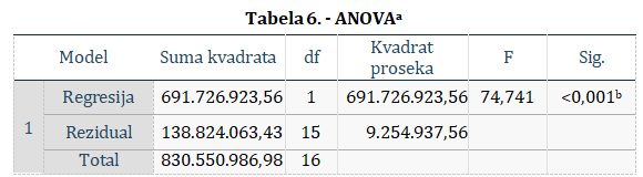 U ovoj tabeli prikazana je F vrednost za sva tri modela, a imajući u vidu da je F vrednost u trećem modelu značajna u visokoj meri (Sig.<0,001), možemo zaključiti i to da je model takođe visoko efikasan.