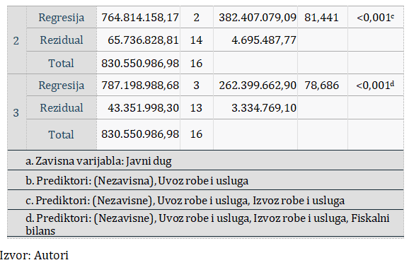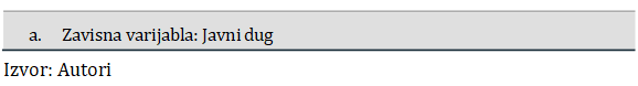 Na osnovu napred navedenog možemo zaključiti da Uvoz i Izvoz robe i usluga, kao i Fiskalni bilans imaju značajnu ulogu u definisanju Javnog duga Republike Srbije, odnosno da je varijacija javnog duga Republike Srbije u 94,8% slučajeva objašnjena varijacijama ove tri nezavisno promenljive.