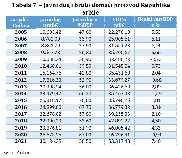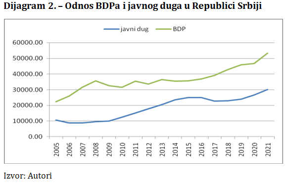 Ovim radom su autori pokušali da objasne zavisnost javnog duga Republike Srbije, nekim drugim makroekonomskim agregatima i činiocima te su u to svrhu primenili tehniku višestruke regresione analize. U istraživanje je posmatran javni dug Republike Srbije u periodu od sedamnaest godina (od 2005. godine do 2021. godine), i to kroz bruto domaći proizvod, devizne rezerve Narodne Banke Srbije, uvoz robe i usluga, izvoz robe i usluga, prosečnu mesečnu zaradu u Republici Srbiji, spoljni dug i fiskalni bilans.
