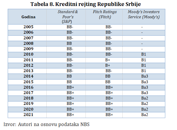 Određeni autori ukazuju na usku povezanos javnog duga države i njen kreditni rejting (Ristić i sar., 2012). U tom konekstu, posmatranjem kreditnog rejtinga Republike Srbije prema tri najuticajnije agencije na finansijskom tržištu5 (Tabela 8.), u posmatranom periodu, kretao u sledećim kategorijama.