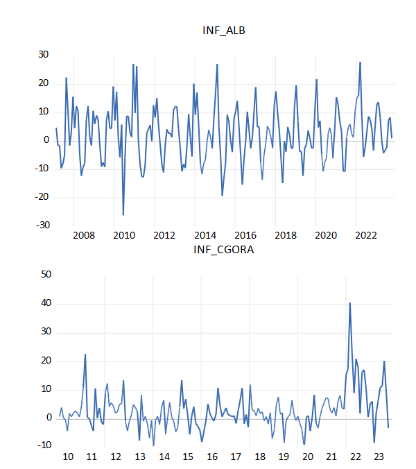 U empirijskoj analizi koristili smo mesečne podatke o harmonizovanom indeksu potrošačkih cena (HICP) za Srbiju, Tursku i Severnu Makedoniju dobijene sa vebsajta Eurostata, i podatke o CPI indeksu u slučaju Crne Gore i Albanije dobijene sa vebsajta zavoda za statistiku posmatranih zemalja. Empirijska analiza je sprovedena za period januar 2007–oktobar 2023. godine, osim u slučaju Crne Gore gde analiza obuhvata period januar 2010– oktobar 2023, za koji postoje raspoloživi podaci. Vrednost mesečne inflacije izračunata je kao: , a množenje sa 1200 je izvršeno da bi se odredio njihov rast na godišnjem nivou.