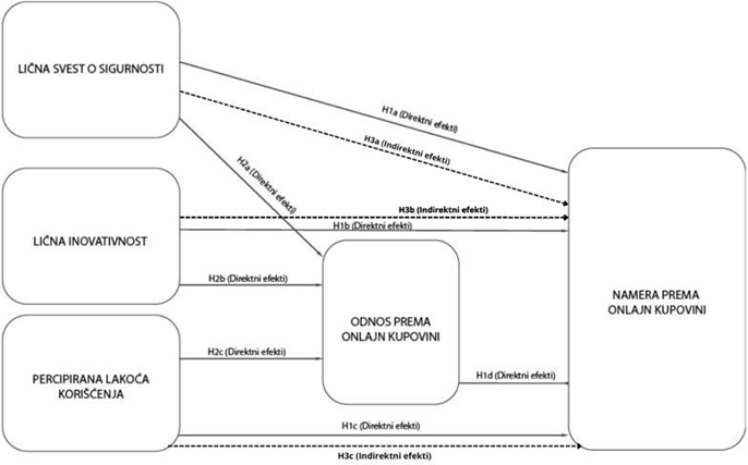 H3a: Sigurnost indirektno utičen na nameru prema onlajn kupovini. H3b: Lična inovativnost indirektno utičen na nameru prema onlajn kupovini.