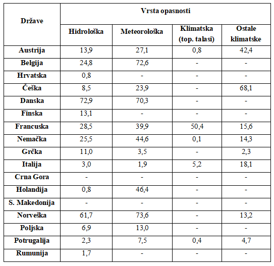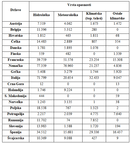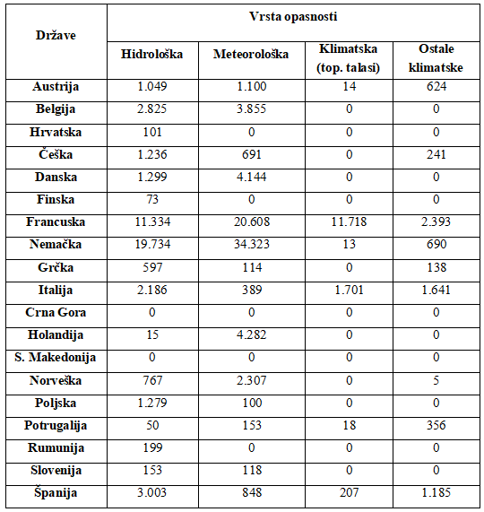 Kada se govori o vrstama opasnosti, za potrebe analize je izvršena podela opasnosti u četiri kategorije: hidrološke, meteorološke, klimatske i ostale klimatske. Pod hidrološkim opasnostima se podrazumevaju opasnosti od svih vrsta poplava, dok se pod meteorološkim smatraju opasnosti od oluje, grada, vetra i drugih padavina. Klimatološke opasnosti su podeljene u dve grupe i to: toplotni talasi i ostale klimatske opasnosti (šumski požari, suše, mrazevi i hladni periodi). Geofizički događaji poput vulkanskih erupcija, zemljotresa i sl., nisu predmet analize. Vrednosti ekonomskih gubitaka svake od realizovanih opasnosti su predstavljeni u Tabeli 4.