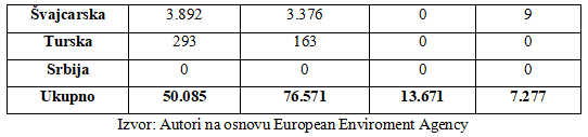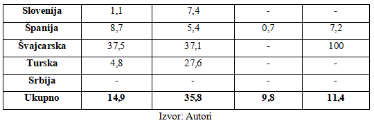 (6,7%), Portugalija (3,5%), Rumunija (1,0%), Slovenija (1,5%), Španija (5,5%) i Turska (6,6%). Poslednjoj grupi zemalja sa učešćem osiguranih gubitaka u rasponu 11-20% pripadaju samo Austrija i Češka sa 18,9 i 11,% respektivno. Kako je već ranije konstatovano, odsustvo osiguranih gubitaka od posledica ekstremnih vremenskih i klimatskih uslova u Srbiji, Crnoj Gori i Severnoj Makedoniji, tako je njihovo učešće jednako nuli što pokazuju i podaci u tabeli 3.