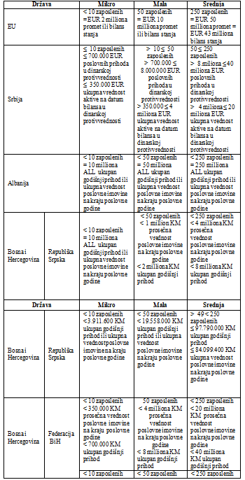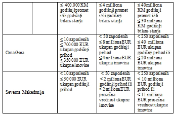 Izvori: Evropska Komisija, Preporuka Evropske Komisije 2003/361/EC; Republika Srbija, Zakon o računovodstvu, Član 6, Službeni glasnik RS, br. 73/2019 i 44/2021 - dr. zakon; Republika Albanija, Zakon br. 43/2022, Zakon o razvoju mikro, malih i srednjih preduzeća (MSMEs); Republika Srpska, Zakon o računovodstvu i reviziji Republike Srpske, Član 5, Službeni Glasnik Republike Srpske, br. 94/2015 i 78/2020; Republika Srpska, Zakon o razvoju malih i srednjih preduzeća, Član 6, Službeni Glasnik Republike Srpske, br. 50/2013, 56/2013 - ispr. i 84/2019; Federacija BiH, Zakon o računovodstvu i reviziji u Federaciji Bosne i Hercegovine, Član 5, Službene novine FBiH br. 15/2021; Federacija BiH, Zakon o poticanju razvoja male privrede, Član 4, Službene novine FBiH br. 19/2006 i 25/2009; Crna Gora, Zakon o računovodstvu, Član 6. "Službeni list Crne Gore", br. 145/21 od 31.12.2021; Republika Severna Makedonija, Zakon o trgovinskim društvima, Član470. “Služben vesnik na RM ” br. 28/2004, 84/2005, 25/2007, 87/2008, 42/2010, 48/2010, 24/2011, 166/2012, 70/2013,119/2013, 120/2013, 187/2013, 38/2014, 41/2014, 138/2014, 88/2015, 192/2015, 6/2016, 30/2016, 61/2016, 64/2018,120/2018, 195/2018 i 239/18, Zakon o trgovinskim društvima, „Služben vesnik na RSM “ br.290/2020, 215/2021 i 99/2022).